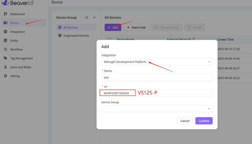 ステップ4. Beaver IoTプラットフォームにVS125-Pを追加。