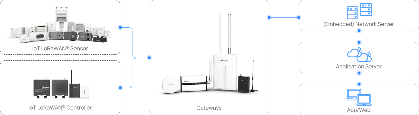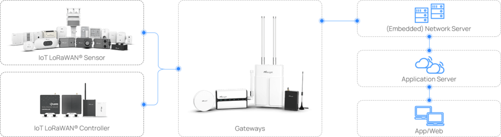 ゲートウェイ | LoRa電波をIPパケットに変換し、ネットワークサーバへ中継 |